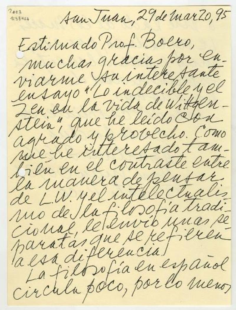San Juan, Puerto Rico [a] Mario Boero, Madrid, España Carta, 1995 marzo 29, [manuscrito] Carla Cordua.