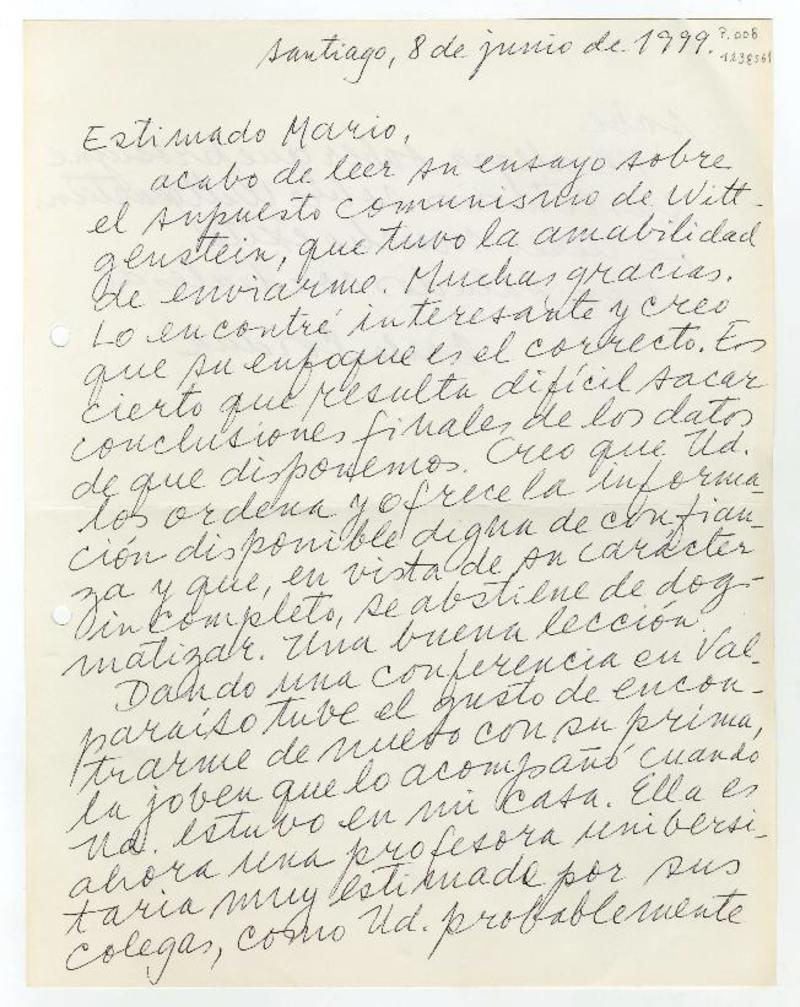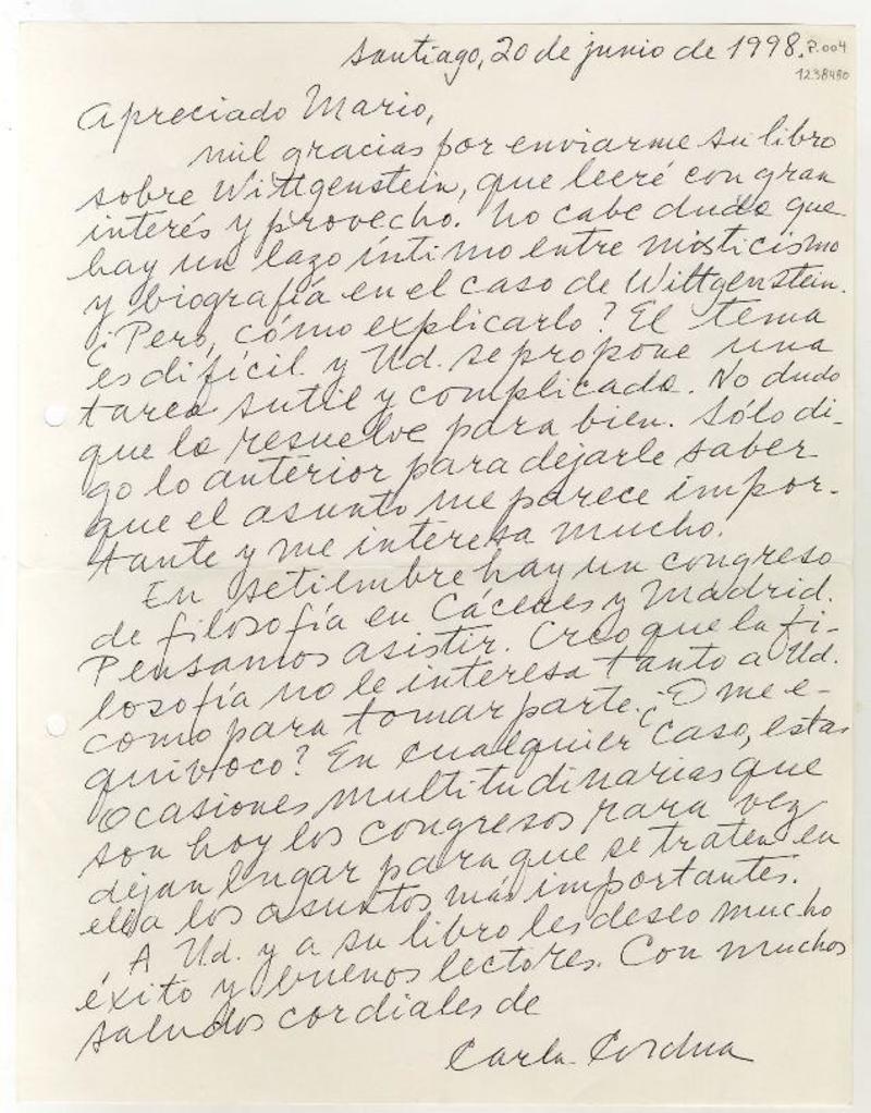 Santiago, Chile [a] Mario Boero, Madrid, España Carta, 1999 junio 8, [manuscrito] Carla Cordua.