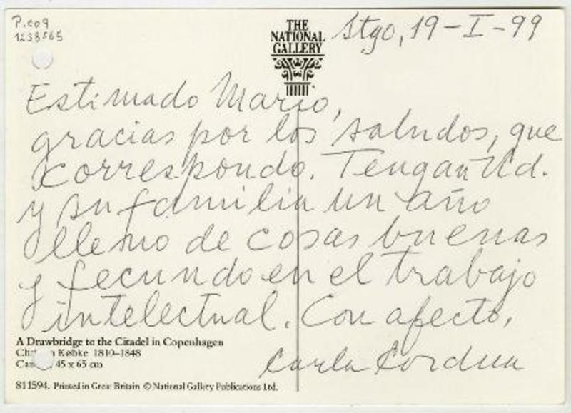 Santiago, Chile [a] Mario Boero, Madrid, España Tarjeta, 1998 febrero 16, [manuscrito] Carla Cordua.