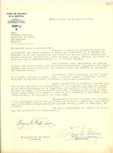 [Carta] 1949, abr. 23, Buenos Aires [a] Gabriela Mistral, Consulado de Chile, Los Angeles, EEUU [manuscrito] Unión de Mujeres de la Argentina.