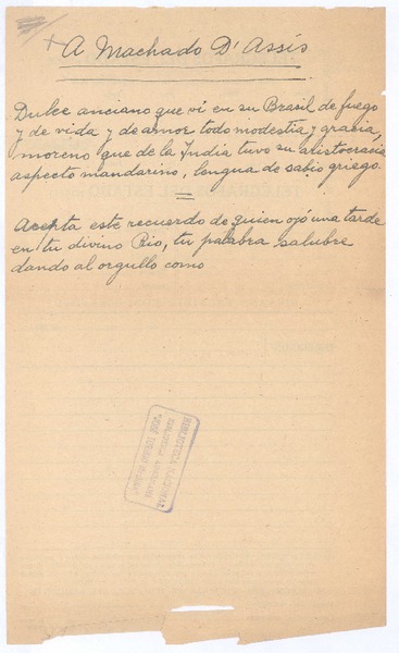 A Machado D'Assis [manuscrito] Rubén Darío; transcripción de Albeerto Ghiraldo.
