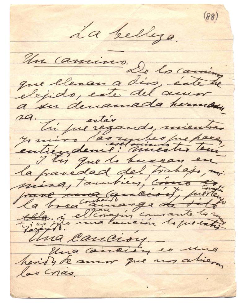 La belleza ; Un camino ; Una Canción; Fatalidad de la belleza ; Religión ; Sustento ; Apacentado [manuscrito] Gabriela Mistral.