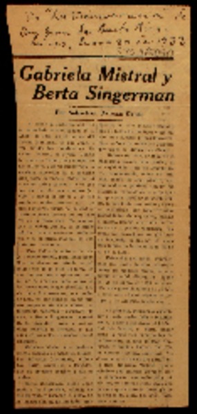 Gabriela Mistral y Berta Singerman [artículo] por Sebastián Dalmau Canet.