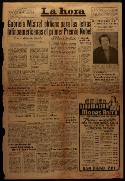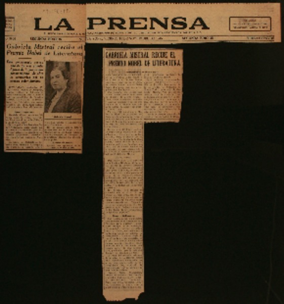 Concediósele el Premio Nóbel a la poetisa chilena Gabriela Mistral [artículo].