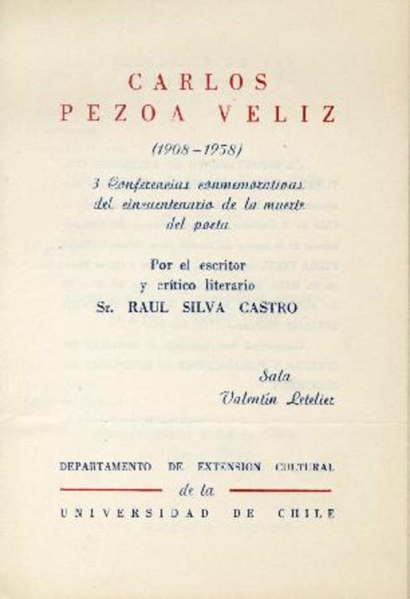 Cincuentenario de la muerte de Carlos Pezoa Veliz, tres conferencias conmemorativas, dictadas por el escritor Raúl Silva Castro.
