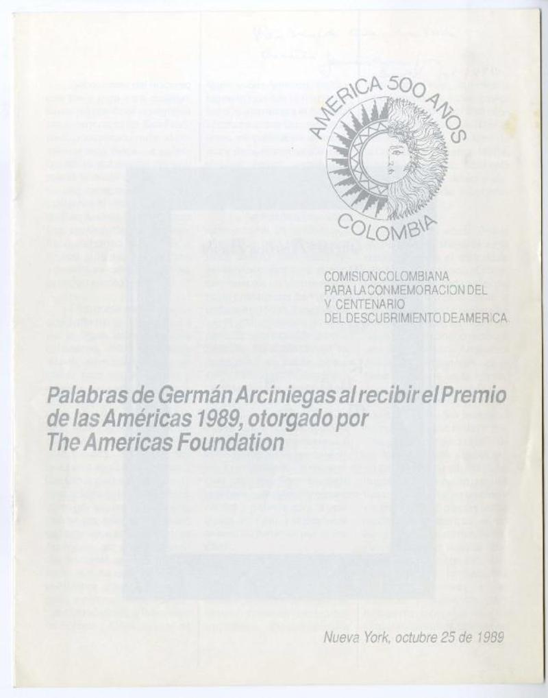 [Revista] América 500 años Colombia : Palabras de Germán Arciniegas al recibir el Premio de las Américas 1989, otorgado por The Americas Foundation publicada por la Comisión Colombiana para la Commemoración del V Centenario del Descubrimiento de América.