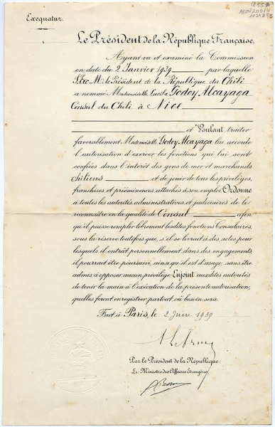 Exequatur [aceptando el nombramiento de Gabriela Mistral como Cónsul de Chile en Nice, Francia] [manuscrito] M. Albert Lebrun, Presidente de la République Française.