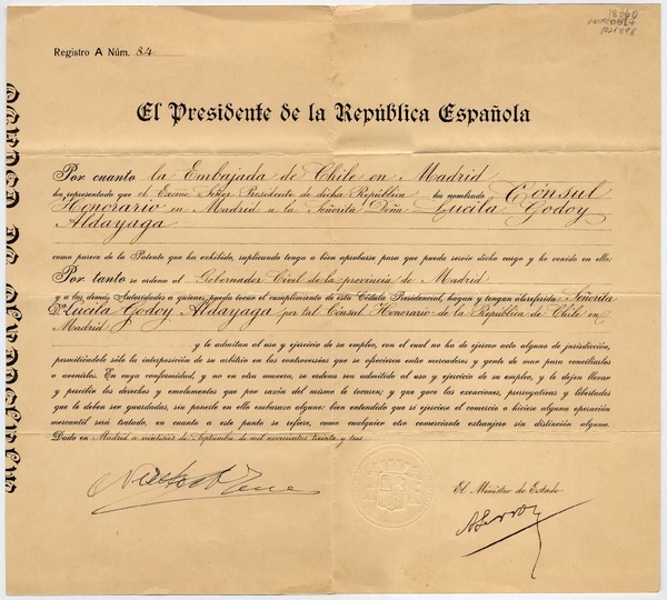 Cédula Presidencial [aceptando el nombramiento de Gabriela Mistral como Cónsul Honorario de Chile en Madrid, España] [manuscrito] Niceto Alcalá-Zamora, Presidente de la República Española.