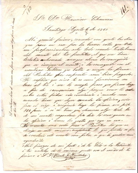 Paris, Francia [a] Humberto Echaurren, Chile Carta, 1860 agosto 6, [manuscrito] Vicente García-Huidobro.