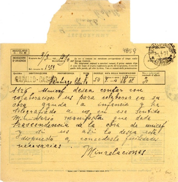 [Telegrama] 1951 abr. 19, Santiago, Chile [a] Gabriela Mistral [manuscrito] Ministerio de Relaciones [Exteriores y Comercio].