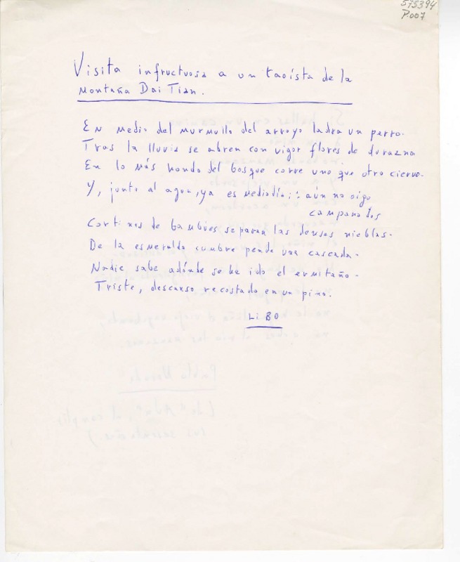 En mi país la primavera [manuscrito] Pablo Neruda.