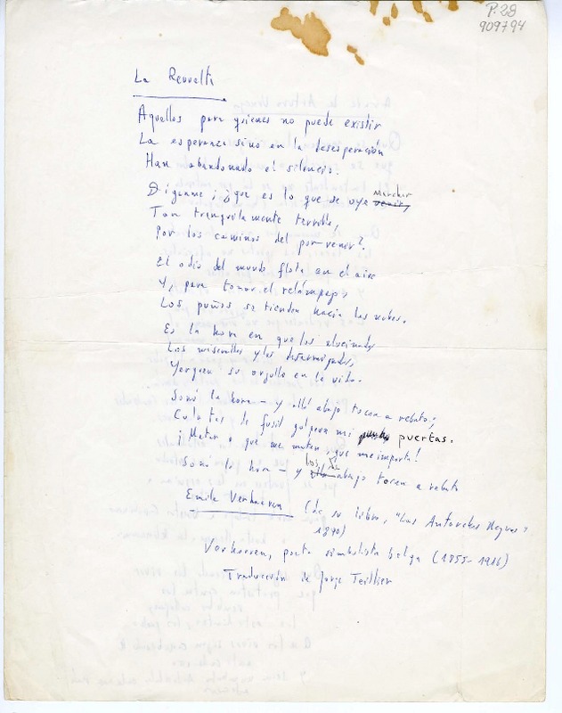 La revuelta [manuscrito] Emile Verhaeren; traducción de Jorge Teillier.