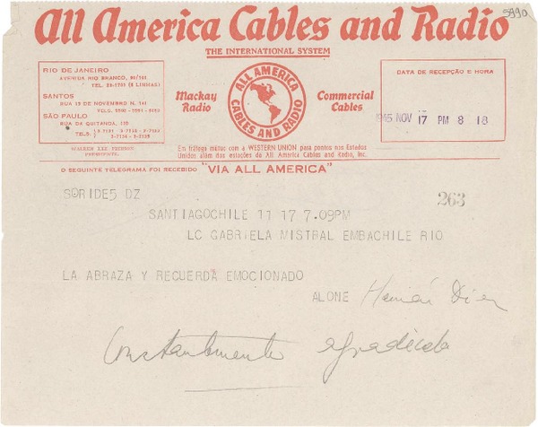 [Telegrama] 1945 nov. 17, Santiago, Chile [a] Gabriela Mistral, Río de Janeiro [manuscrito] Alone.