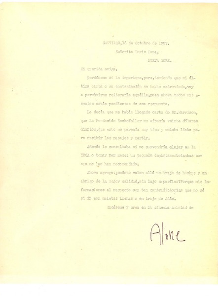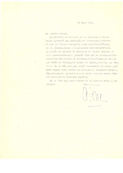 [Carta] 1954 may. 19, [Santiago, Chile] [a] Doris Dana, [New York] [manuscrito] Hernán Díaz Arrieta (Alone).