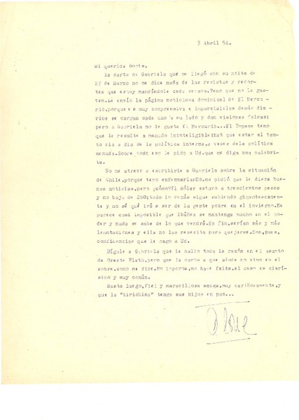 [Carta] 1954 abr. 3, [Santiago, Chile] [a] Doris Dana, [New York] [manuscrito] Hernán Díaz Arrieta (Alone).