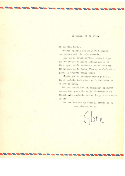 [Carta] 1953 dic. 7, [Santiago, Chile] [a] [Gabriela Mistral] [manuscrito] Alone.