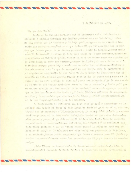 [Carta] 1949 feb. 1, [Santiago] [a] Gabriela Mistral [manuscrito] Alone.