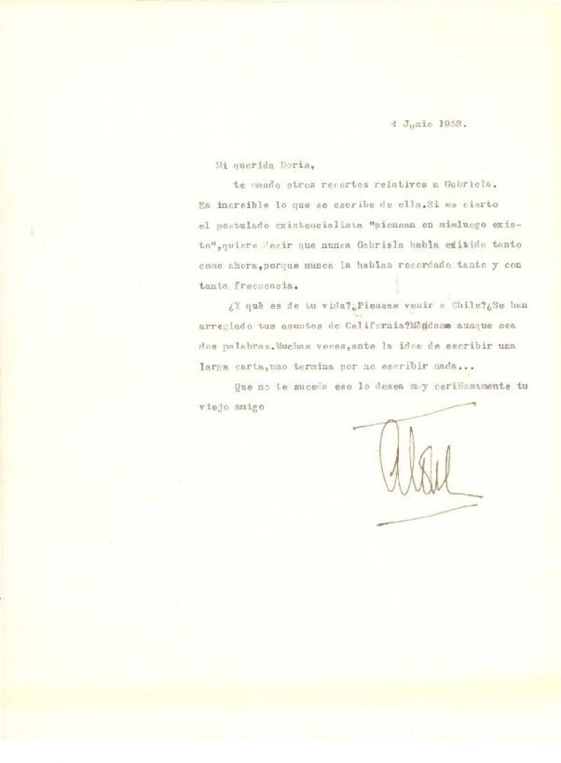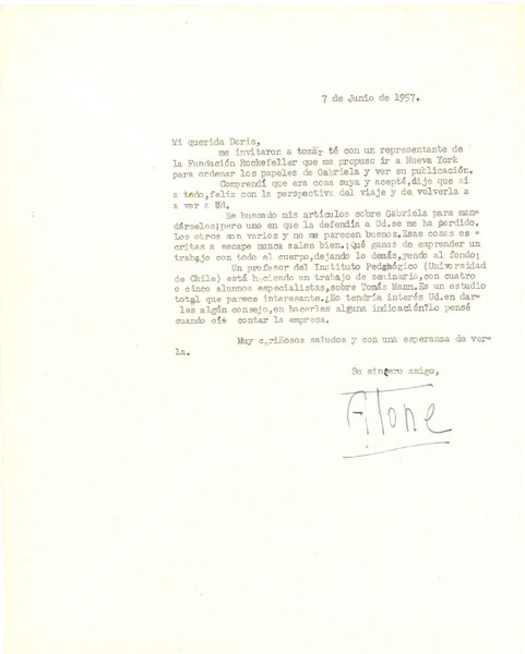 [Carta] 1954 jun. 6, [Santiago] [a] Gabriela Mistral [manuscrito] Alone.