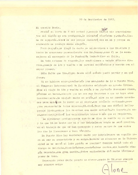 [Carta] 1951 sept. 1, [Santiago] [a] Gabriela Mistral [manuscrito] Alone.