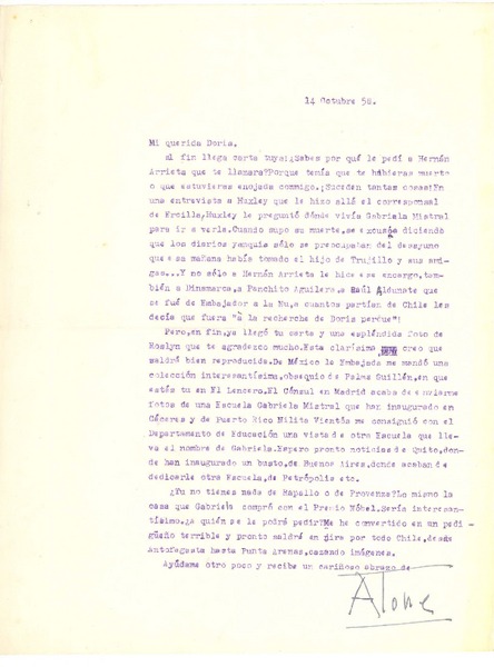 [Carta] 1952 oct. 26, [Santiago, Chile] [a] [Gabriela Mistral] [manuscrito] Alone.