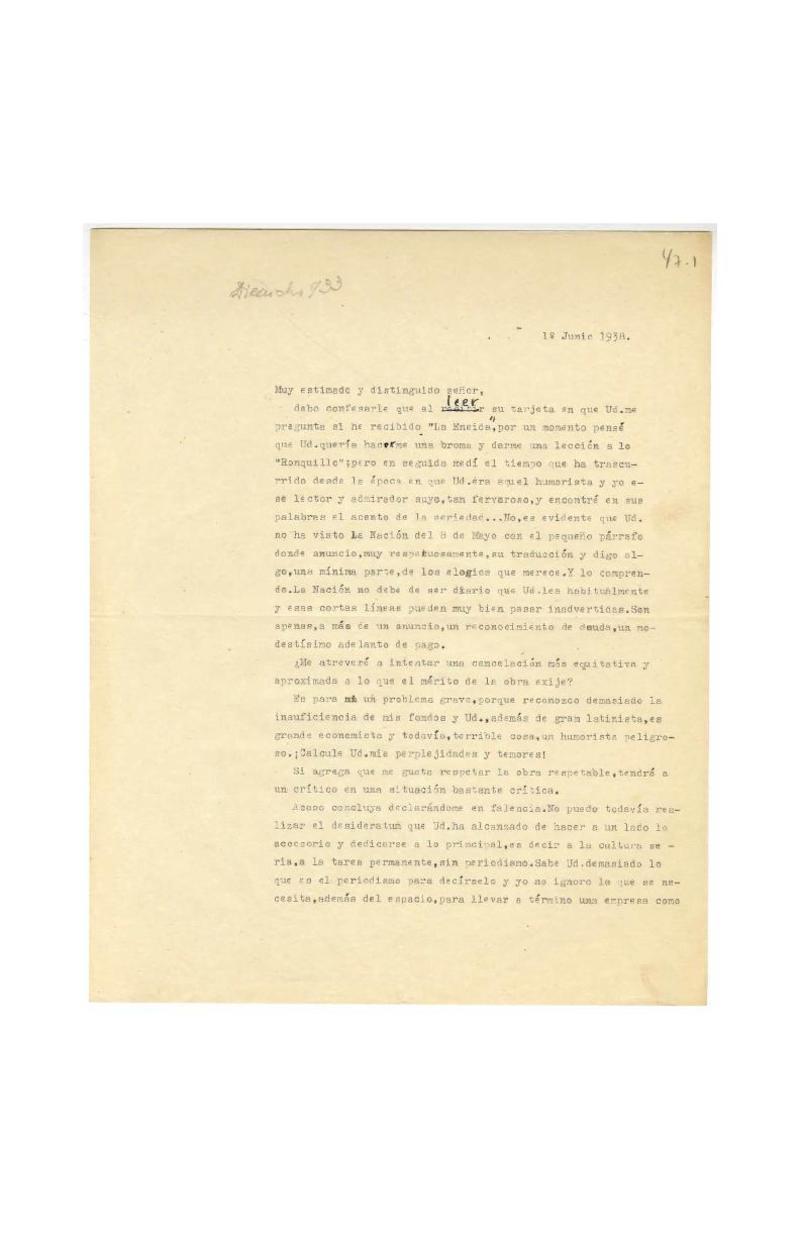 Santiago, Chile [a] Egidio Poblete, Valparaíso, Chile Carta, 1938 junio 1, [manuscrito] Hernán Díaz Arrieta.