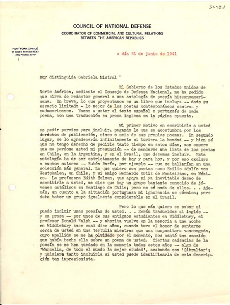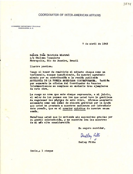 [Carta] 1943 abr. 7, Washington D.C. [a] Gabriela Mistral, Petrópolis, Brasil [manuscrito] Dudley Fitts.