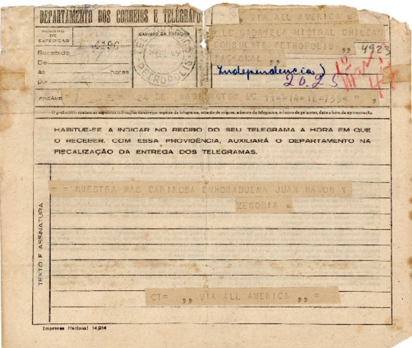 Jiménez, Juan Ramón - Correspondencia - Autores españoles - Mistral, Gabriela - Manuscritos españoles