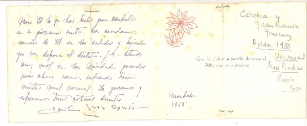[Tarjeta] 1955 dic., San Juan, Puerto Rico [a] Gabriela Mistral [manuscrito] Cenobia y Juan Ramón Jiménez.