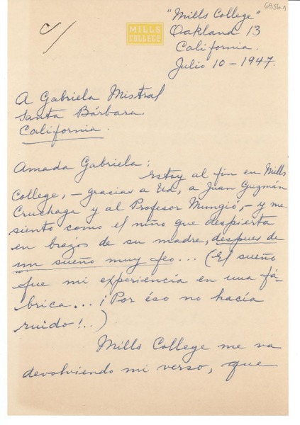 [Carta] 1947 jul. 10, California, [EE.UU.] [a] Gabriela Mistral, Santa Barbara, California, [EE.UU.] [manuscrito] Claudia Lars.