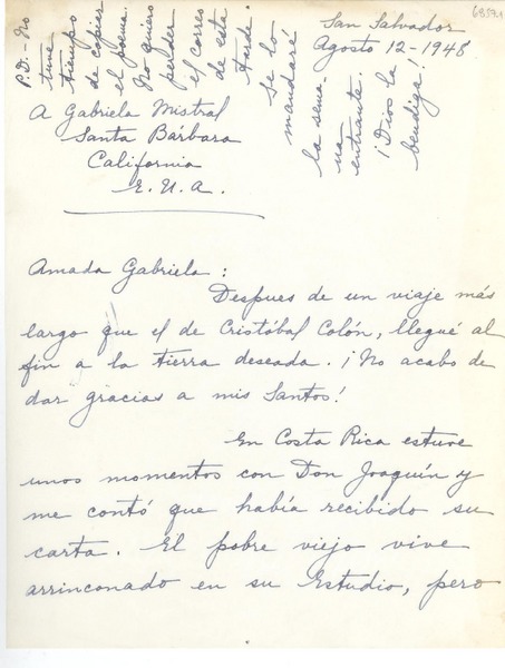 [Carta] 1948 ago. 12, San Salvador, [El Salvador] [a] Gabriela Mistral [manuscrito] Claudia Lars.