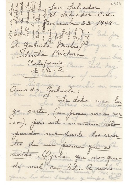 [Carta] 1948 nov. 22, San Salvador, [El Salvador] [a] Gabriela Mistral, Santa Barbara, California, [EE.UU.] [manuscrito] Claudia [Lars].