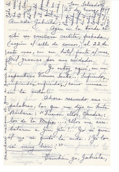 [Carta] 1949 ene. 25, San Salvador, [El Salvador] [a] Gabriela [Mistral] [manuscrito] Claudia Lars.