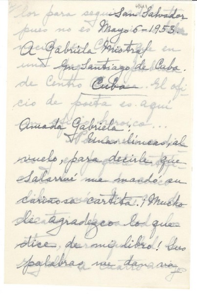 [Carta] 1953 mayo 6, San Salvador, [El Salvador] [a] Gabriela Mistral [manuscrito] Claudia Lars.