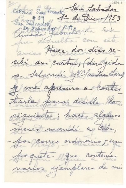 [Carta] 1953 dic. 1, San Salvador, [El Salvador] [a] Gabriela [Mistral] [manuscrito] Claudia Lars.