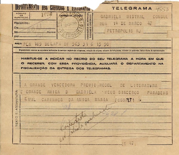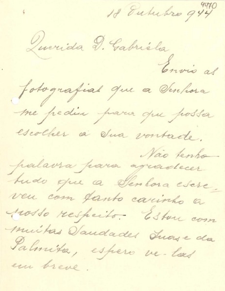 [Carta] 1944 oct. 18, [Brasil] [a] Gabriela Mistral [manuscrito] María Fossati.