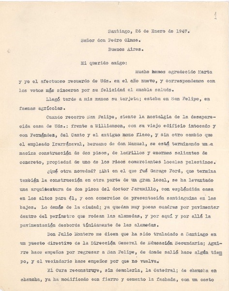 [Carta] 1947 ene. 26, Santiago, Chile [a] Pedro Olmos [manuscrito] Alfonso Bulnes.