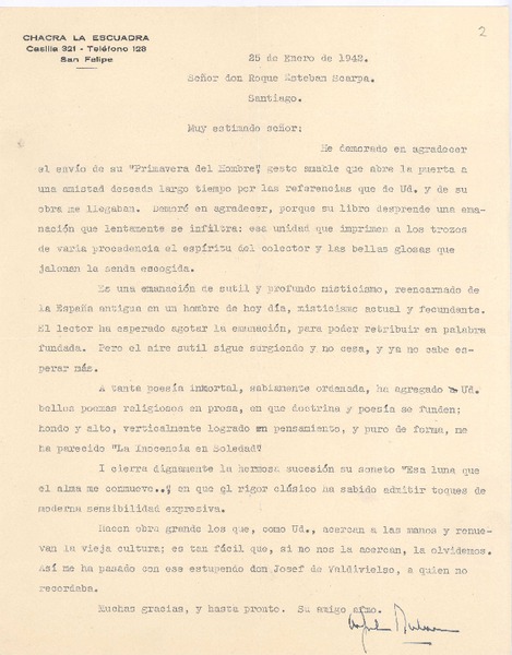 [Carta] 1942 ene. 25, Santiago, Chile [a] Roque Esteban Scarpa [manuscrito] Alfonso Bulnes.