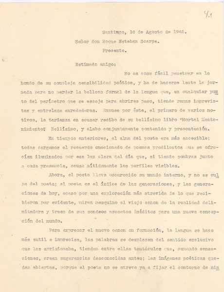 [Carta] 1942 ago. 10, Santiago, Chile [a] Roque Esteban Scarpa [manuscrito] Alfonso Bulnes.