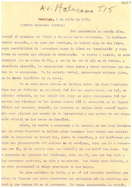 [Carta] 1939 jul. 2, Santiago, [Chile] [a] Gabriela Mistral [manuscrito] De un amigo.