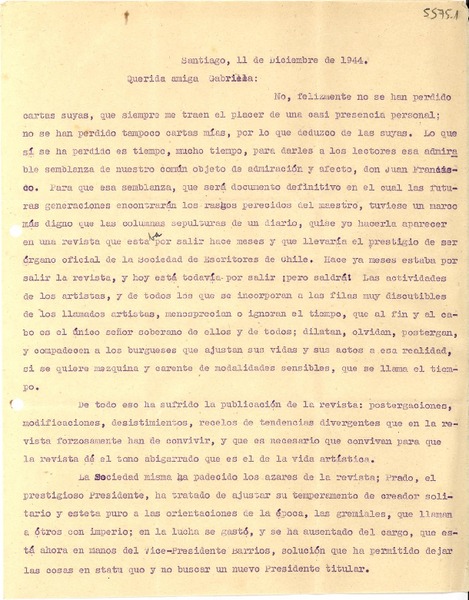[Carta] 1944 dic. 11, Santiago, [Chile] [a] Gabriela [Mistral] [manuscrito] Alfonso Bulnes.