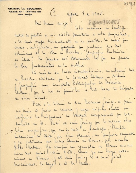 [Carta] 1945 ago. 7, San Felipe, [Chile] [a] [Gabriela Mistral] [manuscrito] Alfonso Bulnes.