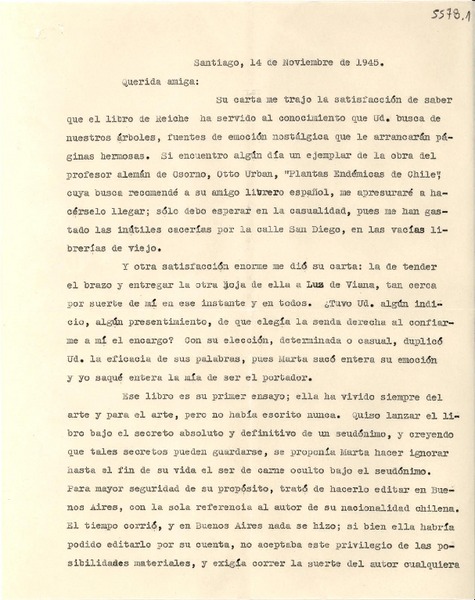 [Carta] 1945 nov. 14, Santiago, [Chile] [a] [Gabriela Mistral] [manuscrito] Alfonso Bulnes.