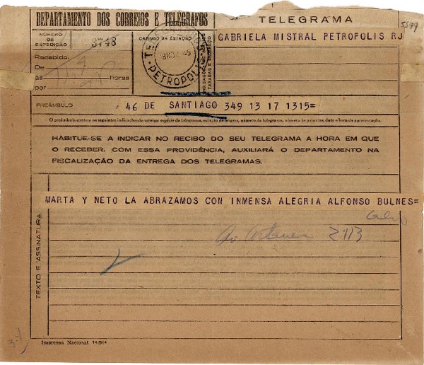 [Telegrama] 1945 nov. 18, Santiago, [Chile] [a] Gabriela Mistral, Petrópolis, RJ, [Brasil] [manuscrito] Alfonso Bulnes.