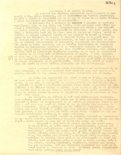[Carta] 1946 ago. 5, Santiago, [Chile] [a] [Gabriela Mistral] [manuscrito] Alfonso Bulnes.