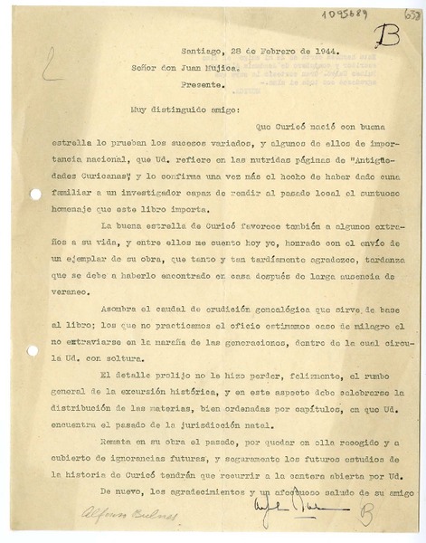 [Carta] 1944 febrero 28, Santiago, Chile [a] Juan Mujica, Bahía Blanca, Argentina [manuscrito] Alfonso Bulnes.