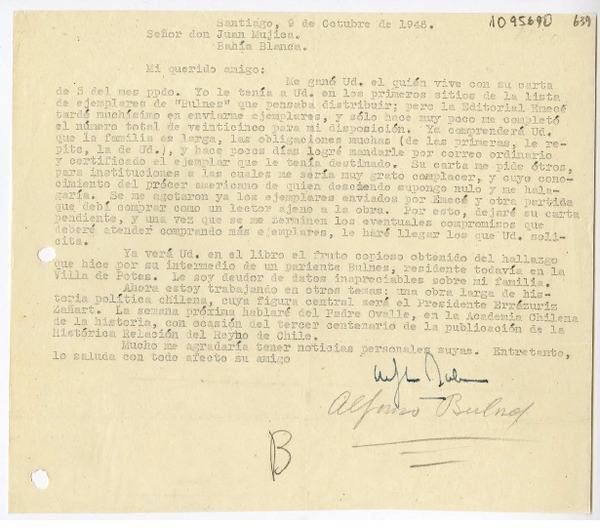 [Carta] 1946 octubre 9, Santiago, Chile [a] Juan Mujica, Bahía Blanca, Argentina [manuscrito] Alfonso Bulnes.
