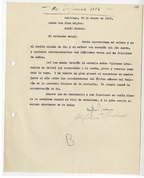 [Carta] 1947 enero 26, Santiago, Chile [a] Juan Mujica, Bahía Blanca, Argentina [manuscrito] Alfonso Bulnes.