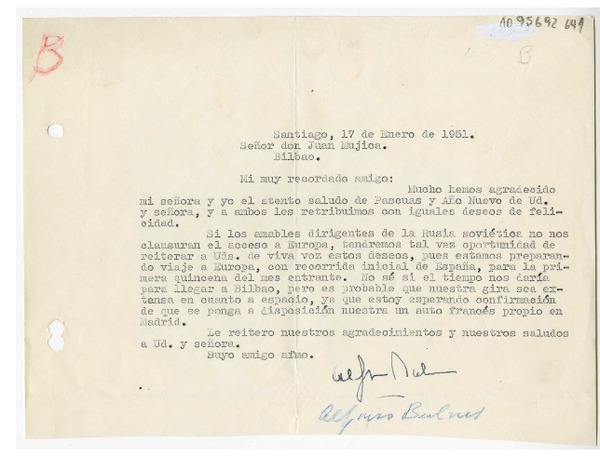 [Carta] 1951 enero 17, Santiago, Chile [a] Juan Mujica, Bilbao, España [manuscrito] Alfonso Bulnes.