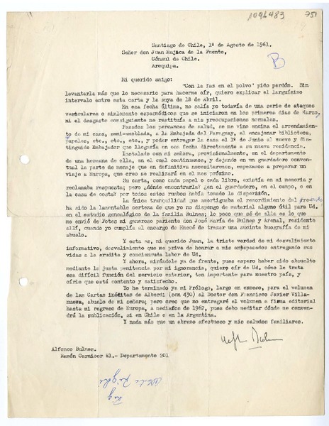 [Carta] 1961 agosto 1, Santiago, Chile, [a] Juan Mujica de la Fuente, Arequipa, Perú [manuscrito] Alfonso Bulnes.