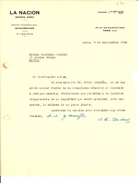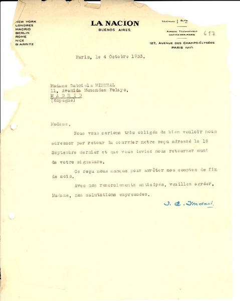 [Carta] 1933 oct. 4, París [a] Gabriela Mistral, Madrid [manuscrito] J. C. Indart.